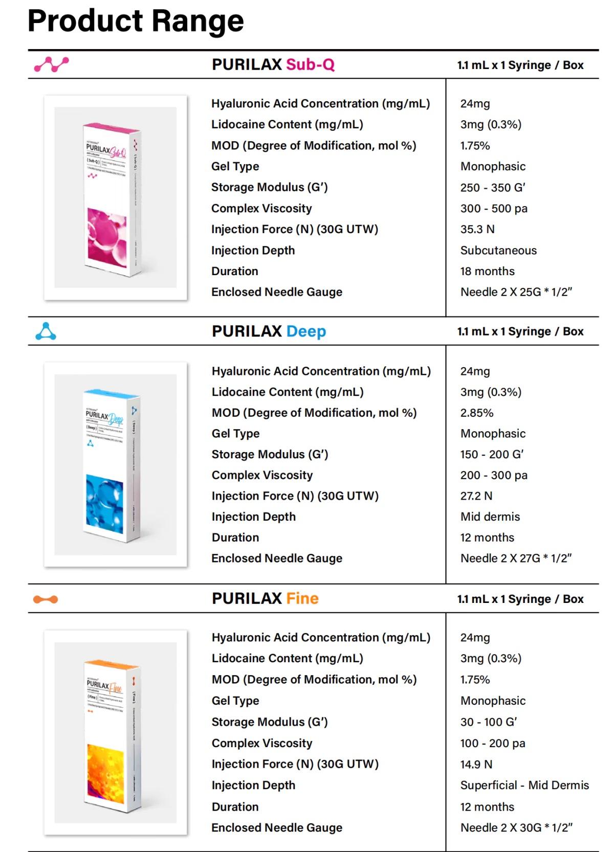 The Purilax Filler Series offers a comprehensive range of hyaluronic acid fillers designed to meet various aesthetic needs with precision and ease. The series includes Purilax Fine, Purilax Deep, and Purilax Sub-Q, each optimized with cross-linked hyaluronic acid and lidocaine to ensure painless, natural-looking results. With high viscoelasticity and cohesion, Purilax fillers integrate seamlessly into the skin, providing volume, hydration, and improved elasticity.
